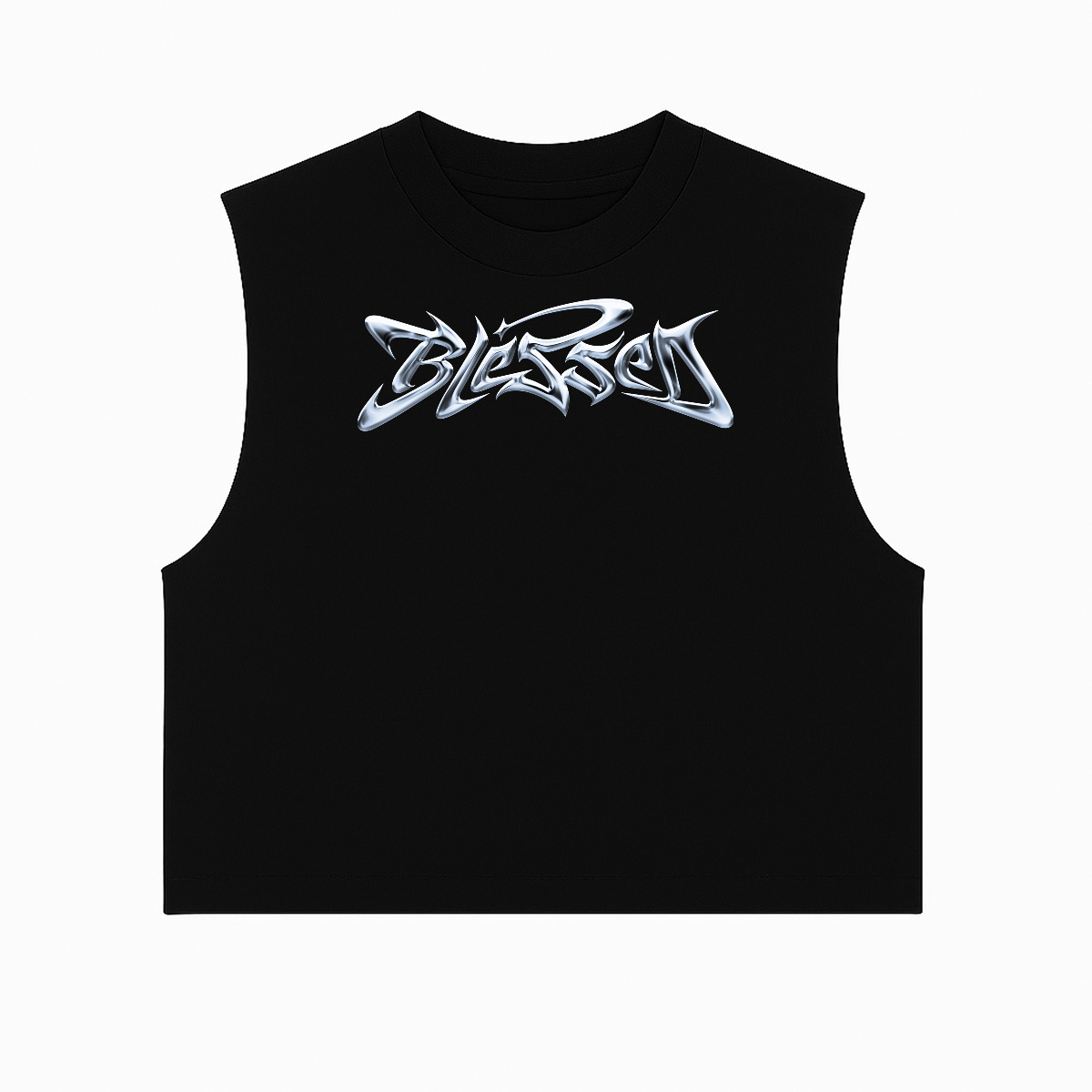 - Chrome “BLESSED” graphic inspired by a superhero chest emblem — faith-fueled and powerful